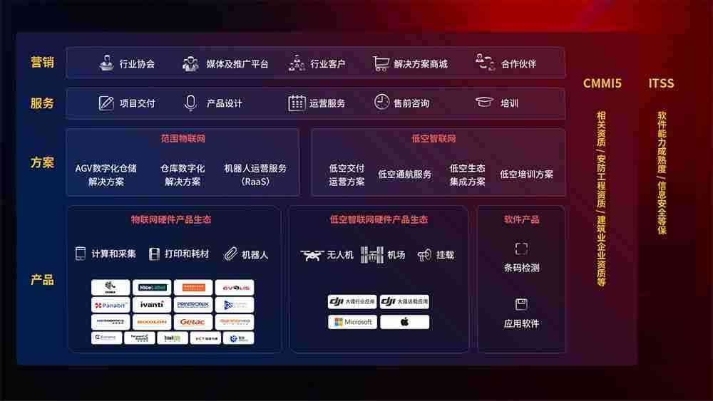 聚合国内外先进的物联网硬件产品品牌,,,,聚焦数字化仓储、、、机器人运营、、、低空智联网等领域,,共同打造适合客户业务场景的解决方案并提供交付服务